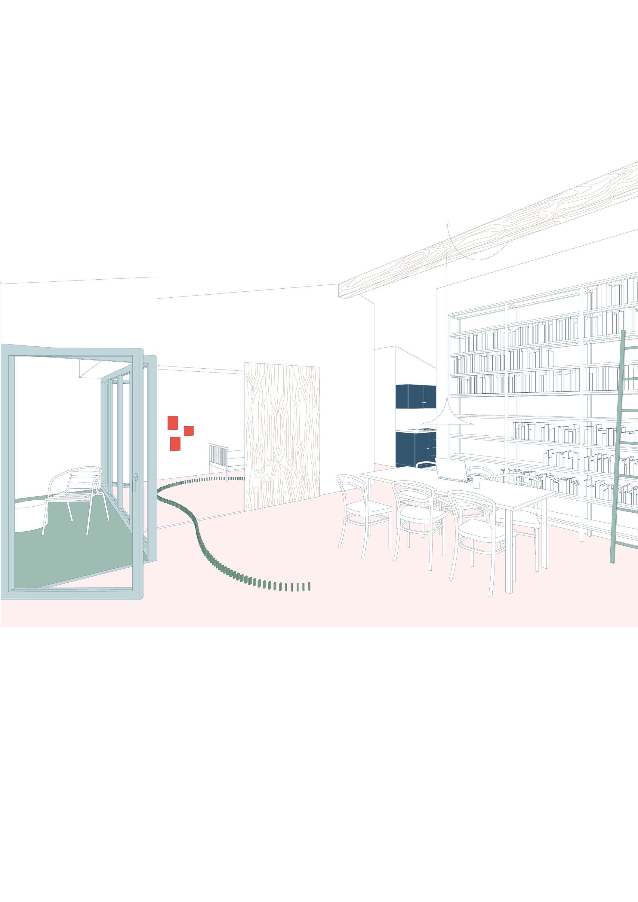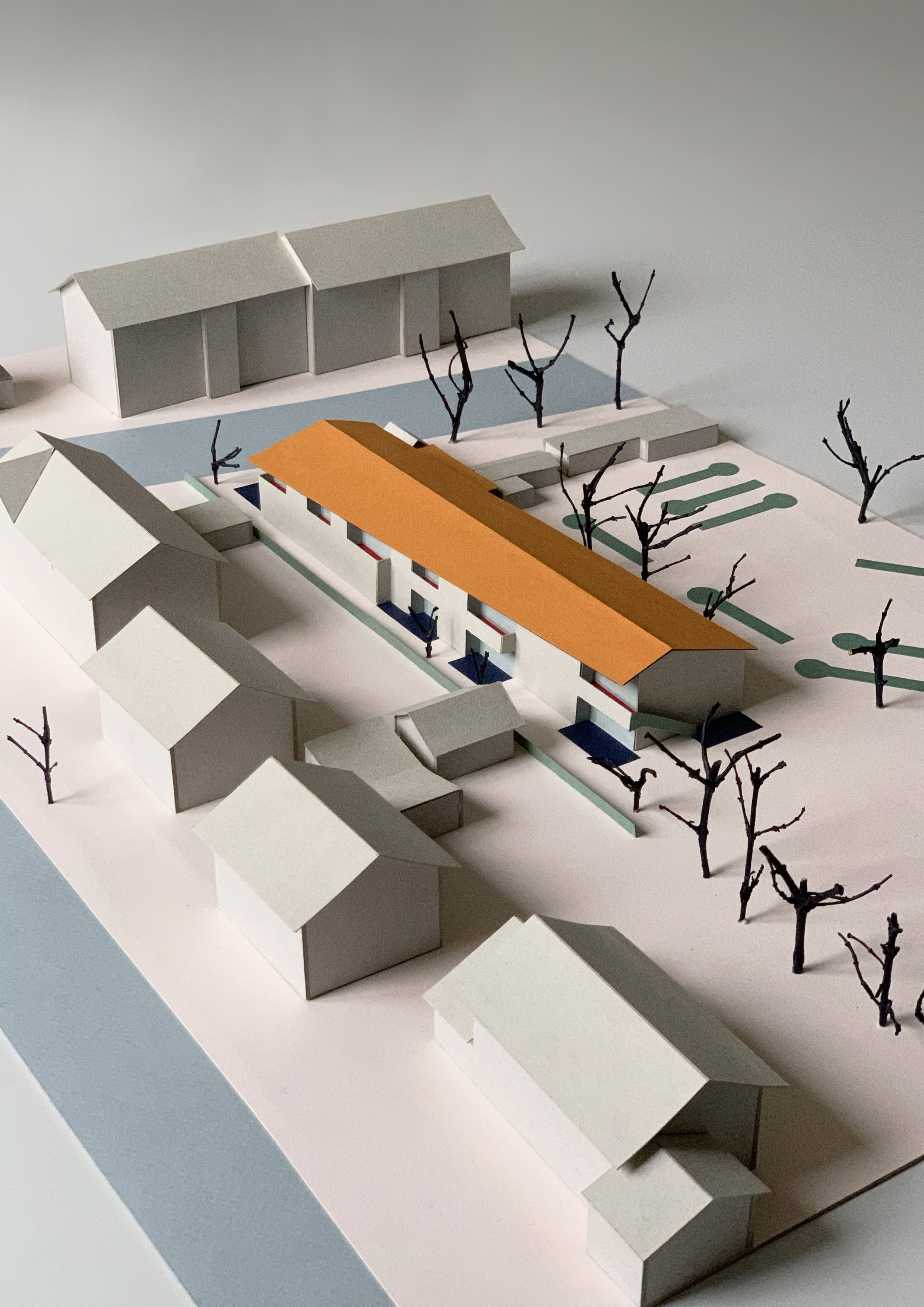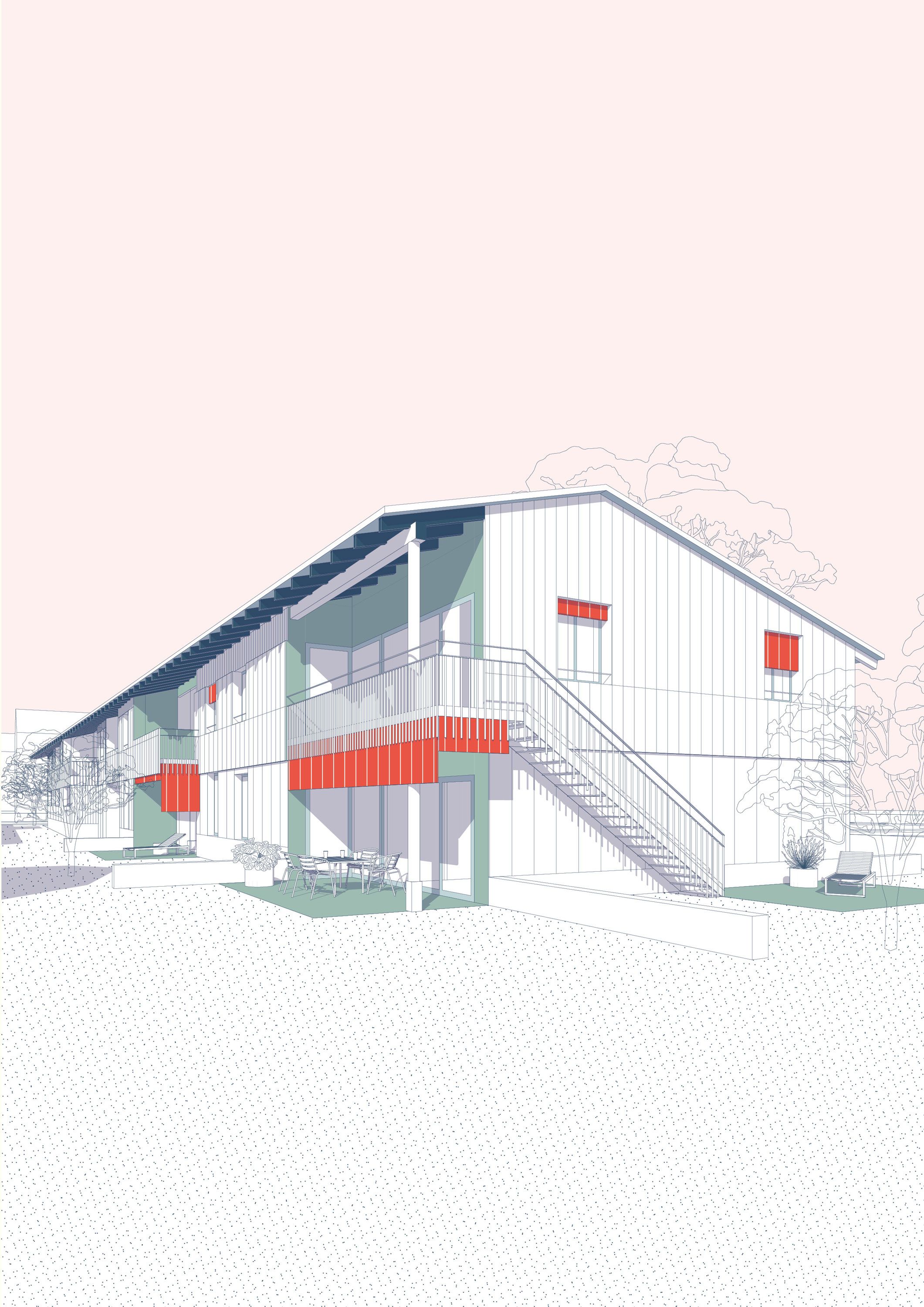 Der Entwurf untersucht wie ein Mehrfamilienhaus mit möglichst einfacher Konstruktion und Typologie mit hochwertigen Materialien umgesetzt werden kann und attraktiven Wohnraum zum Mieten schafft. Der Bauplatz ist ein längliches Grundstück in Zentrumsnähe einer Allgäuer Kleinstadt. Die Wohnungen mit zwei bis vier Zimmer sollen von verschiednen Bewohner:innen gut bewohnt werden können und attraktive Wohn- und Aussenräume bieten. Unter einem grossen Dach befinden sich in einem zweigeschossigen, langen Haus mehrere Wohnungen. Jede Wohnung ist Nord- und Süd ausgerichtet und wird über einen Weg und Aussentreppen direkt erschlossen. Unterirdische Fahrzeugstellplätze und Aufzüge sind nicht notwendige, die Anforderungen an die Haustechnik werden durch die Grundrissaufteilung der Wohnungen reduziert. Die nordseitigen Hoffläche sowie der Garten im Norden wird gemeinsam genutzt, während auf der Südseite durch die Staffelung des Gebäudevolumens für jeden Wohnung private Sitzplätze und Gärten sowie grosse Südbalkone im Obergeschoss sich befinden.