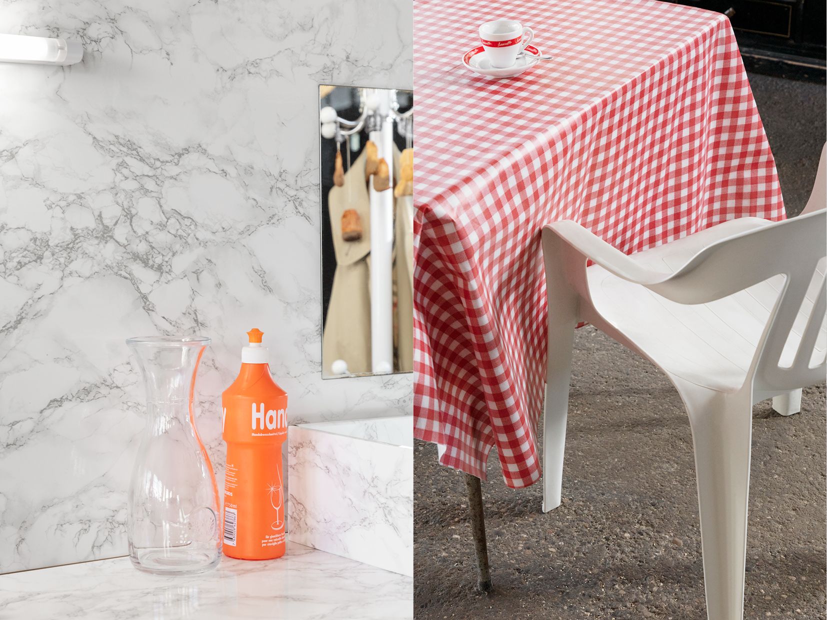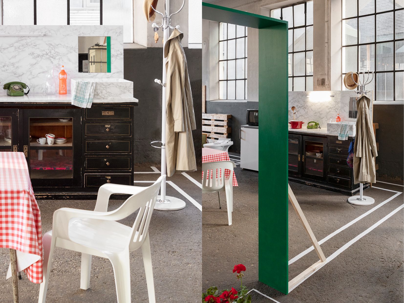 Das Bühnenbild für die Farce "Non Si Paga!"ist zusammengesetzt aus wohnlichen Fragmenten, die Erinnerungen an eine vermeintlich bekannte Wohnung hervorrufen. Präzise gewählte Farben, Muster und Oberflächen sowie angedeutete architektonische Elemente bilden den Rahmen für und gewähren Einblicke in die Handlung. Absurdes und Unsinn sind sowohl in der Farce von Dario Fo als auch im Bühnenbild zu finden.