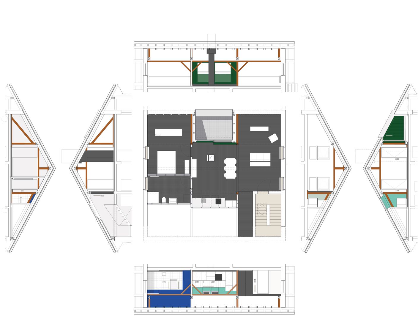 Das Dachgeschoss eines Mehrfamilienhaus wird zu einer Wohnung ausgebaut. Die Raumaufteilung orientiert sich an der Struktur des niedrigen Pfettendachstuhls. Im Süden wird die Dachfläche für eine Dachterrasse und zur besseren Belichtung des tiefen Wohnraumes eingeschnitten.
