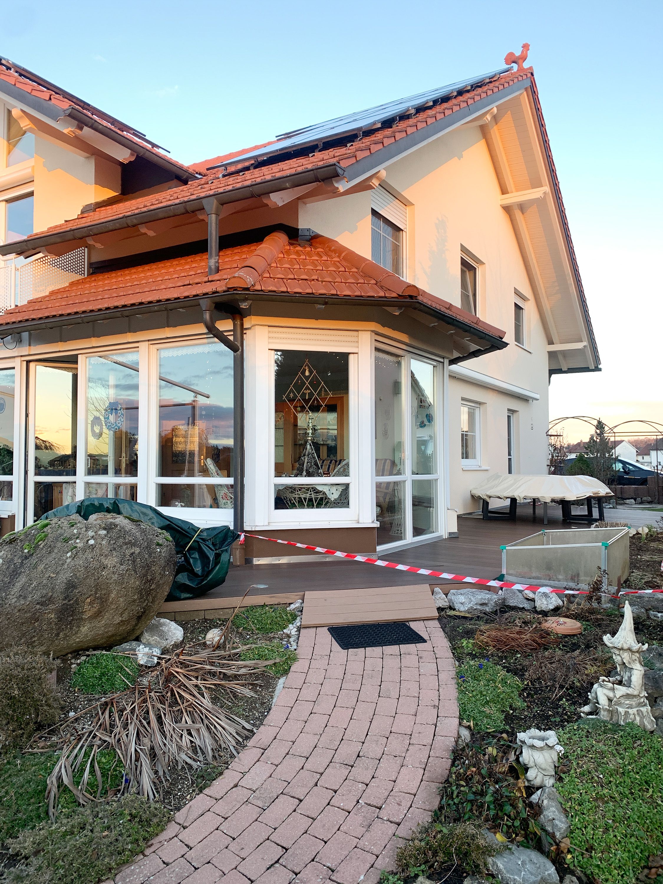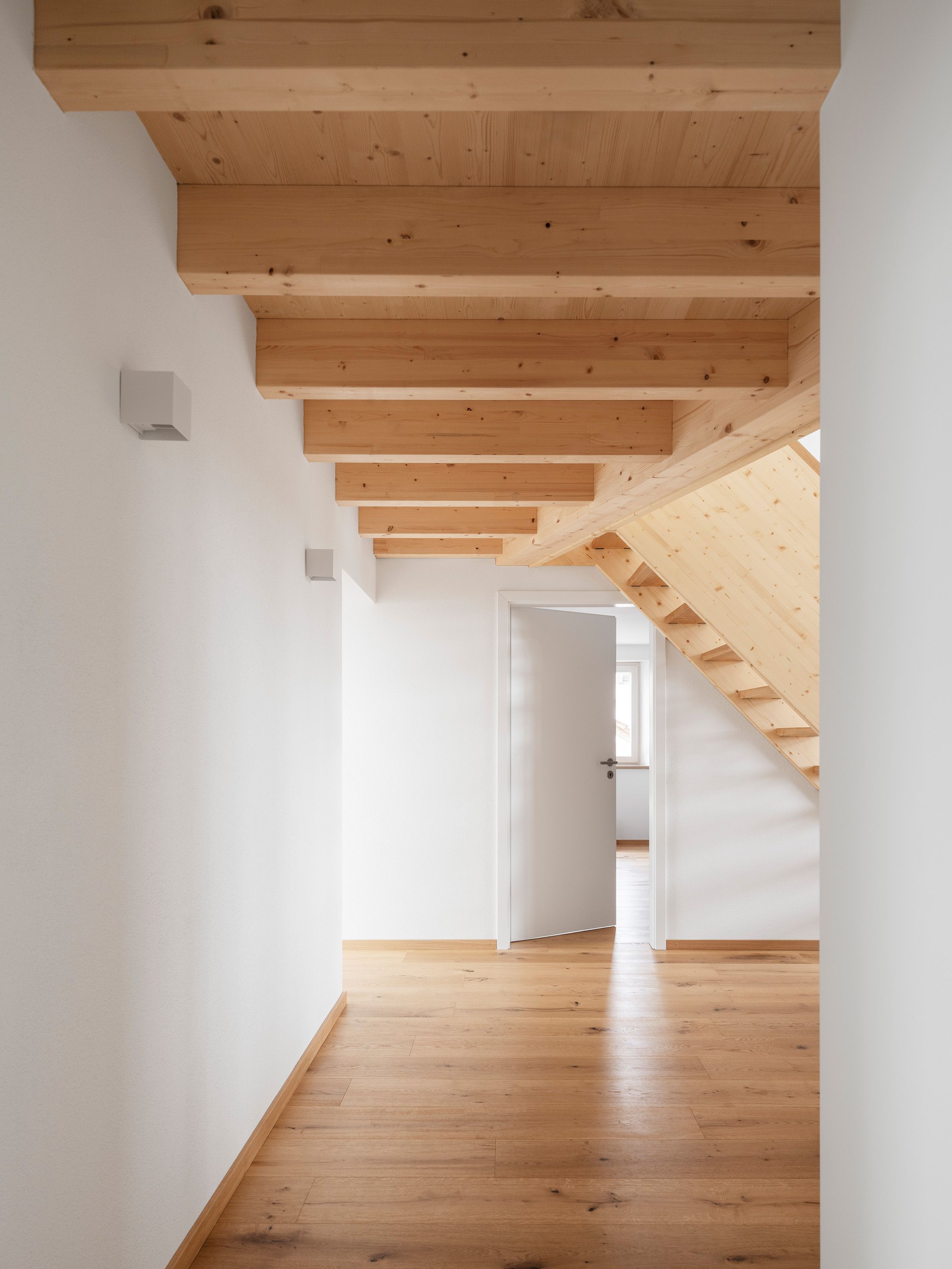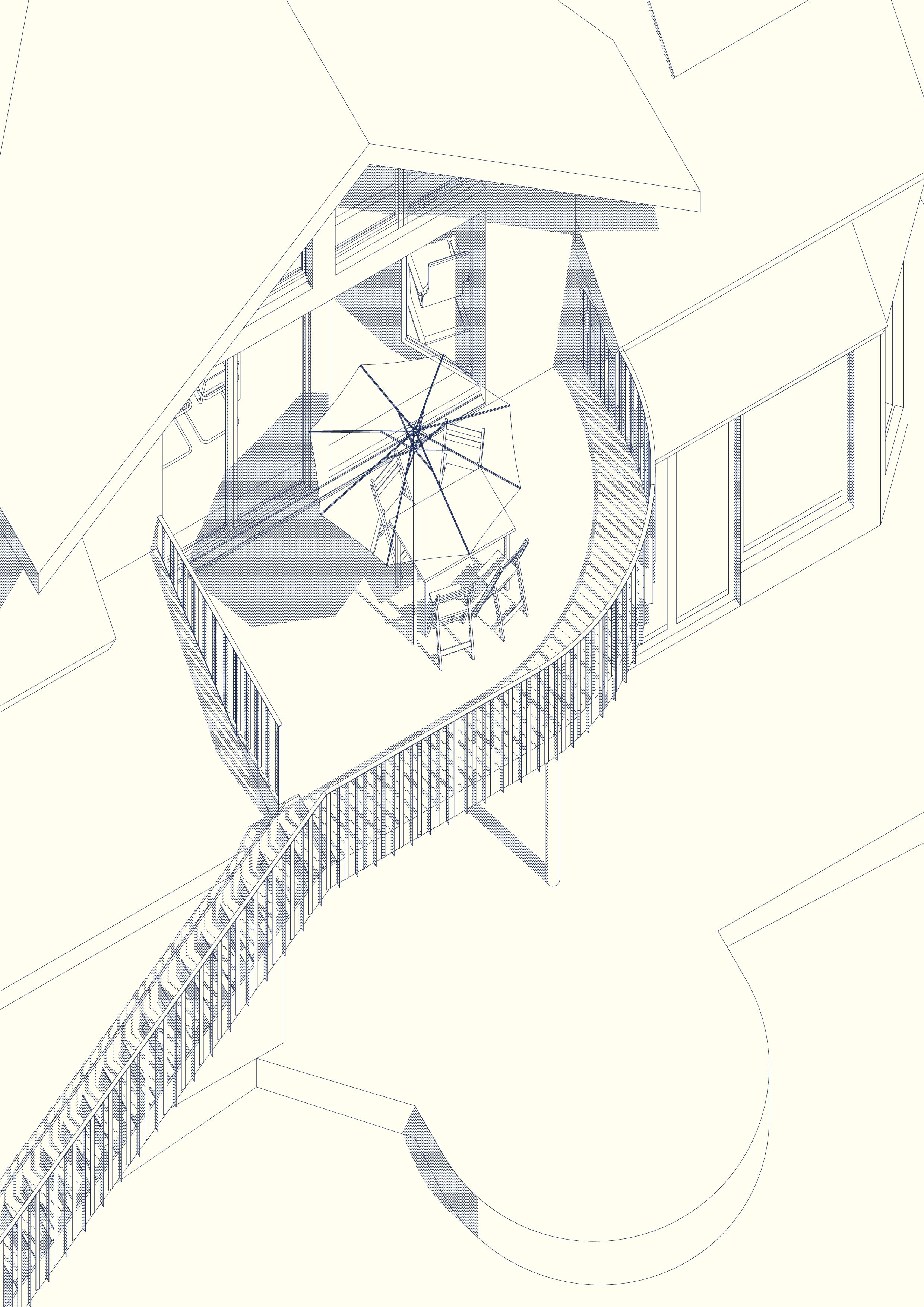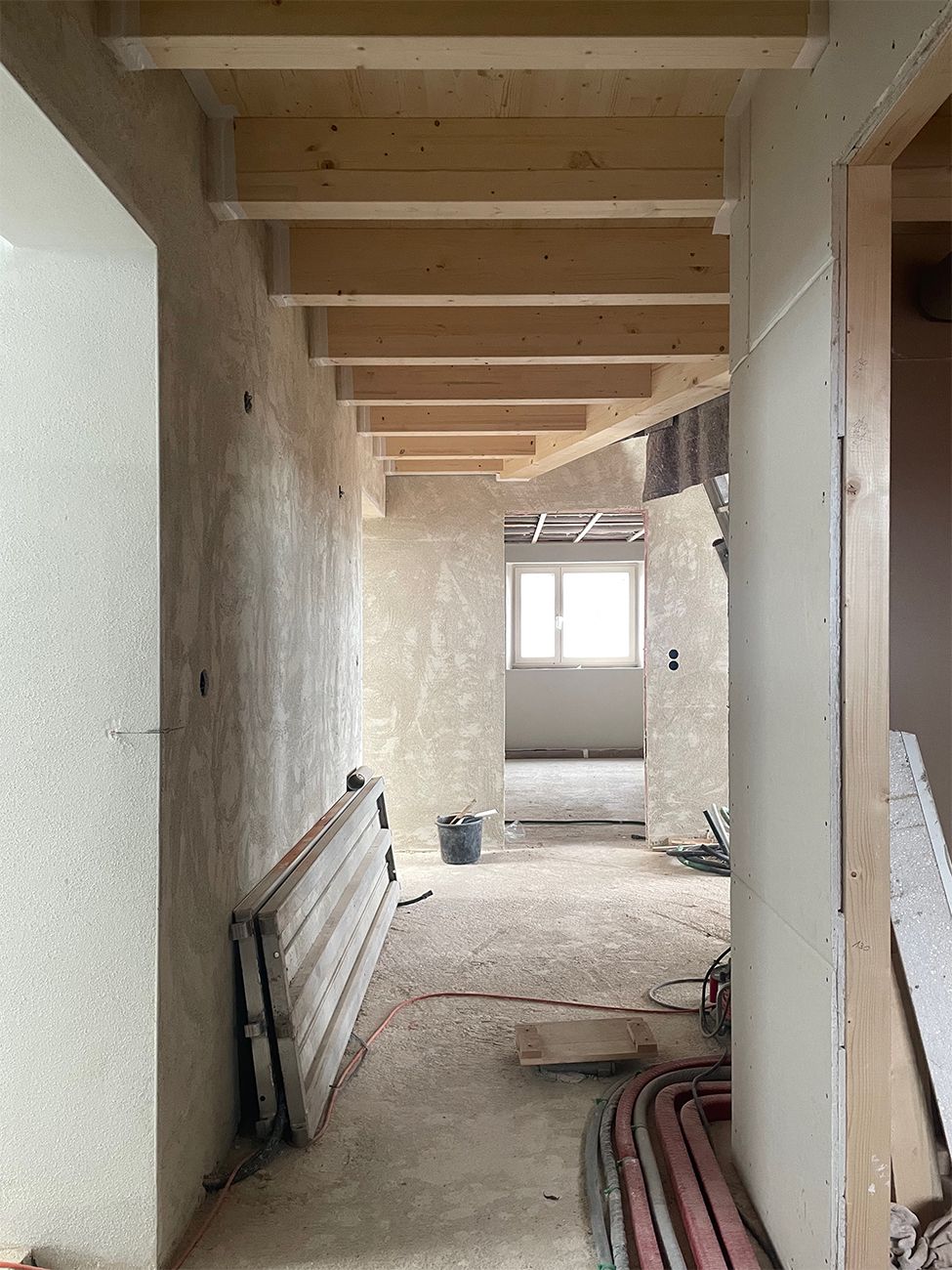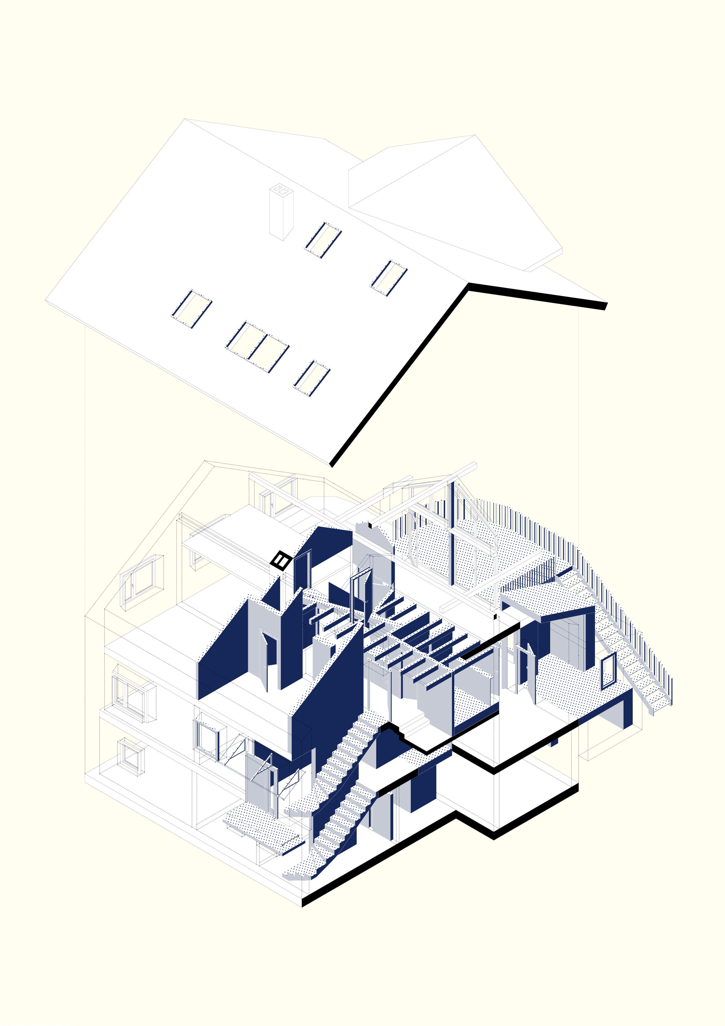 Ein Einfamilienhaus, das schon viel ist und sich knapp 30 Jahren nach seiner Errichtung verändern wird, um zu einem Haus für zwei Familien und drei Generationen zu werden. Auf der Gartenfassade wird das Hausvolumen um einen weiteren Raum für die Erdgeschosswohnung und eine grosszügige Terrasse für die Dachwohnung ergänzt. Im Inneren des Hauses werden die Flure und Treppenräume umgebaut um zu einem gemeinsamen Hauseingang für beide Wohnungen zu werden und neue Raumaufteilungen in den Geschossen mit grosszügigen Wohnräumen, Zimmern und Bädern zu ermöglichen.