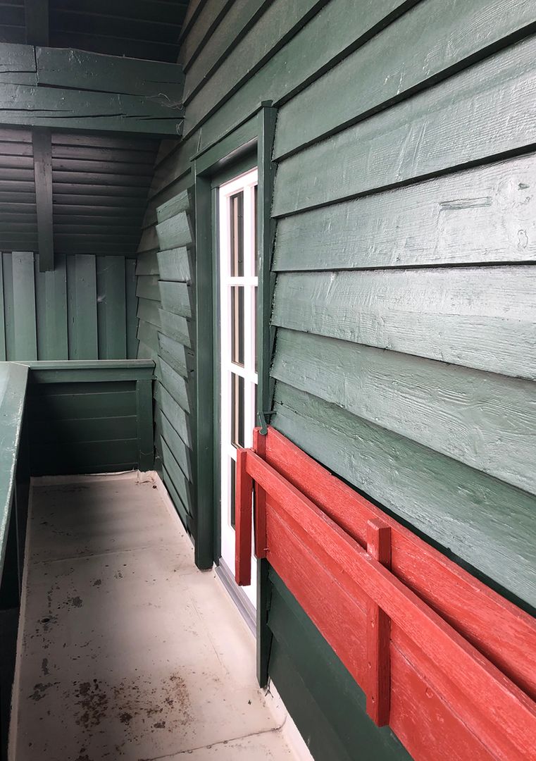 Für die Aussenverschattung zwei südseitiger Balkontüren in der Giebelfassade wird jeweils ein einflügeliger Fensterladen montiert. Der Fensterladen ahmt die grün gestrichene Stülpschalung der Fassade nach und überspielt im geschlossen Zustand die Öffnung.