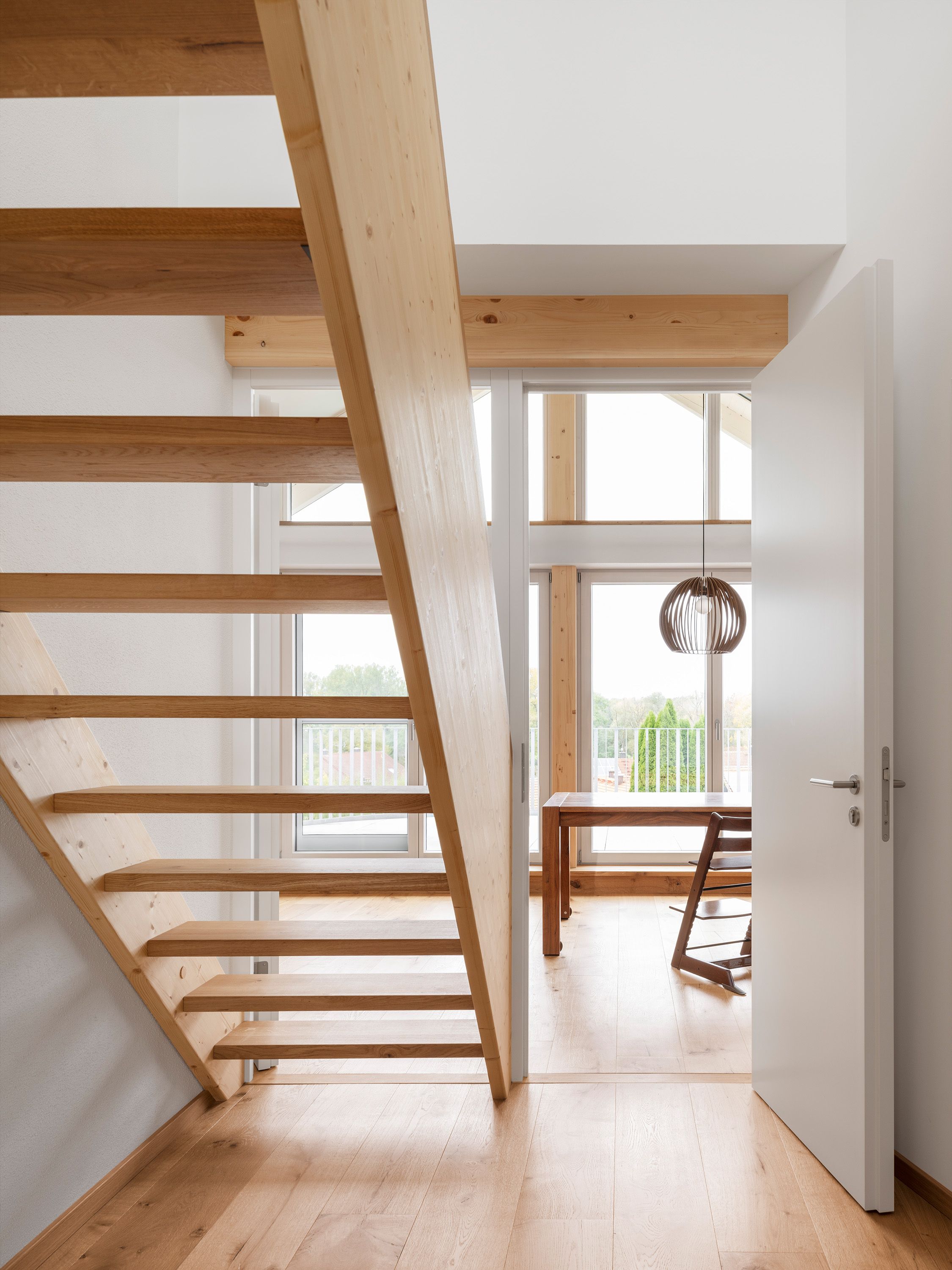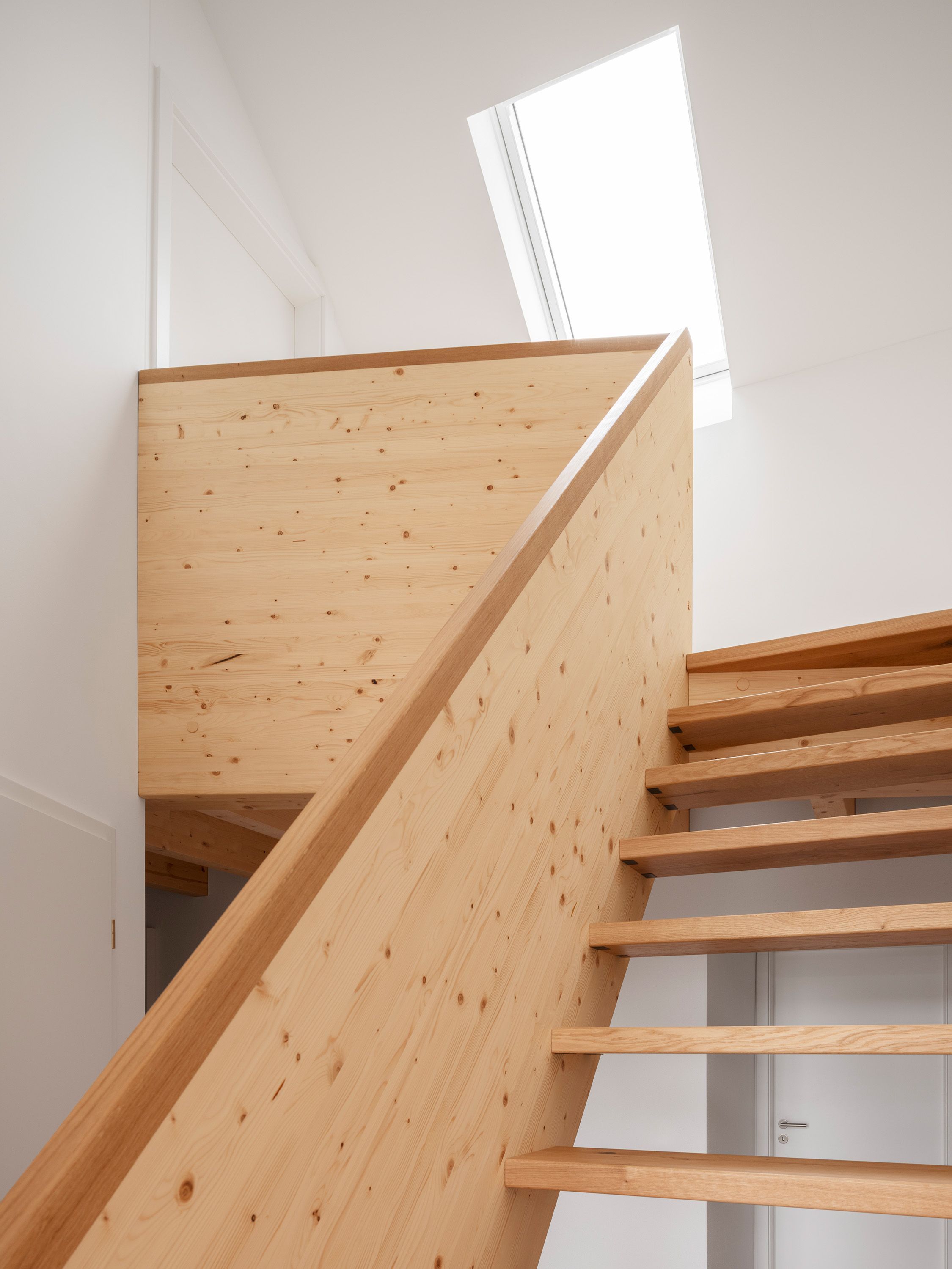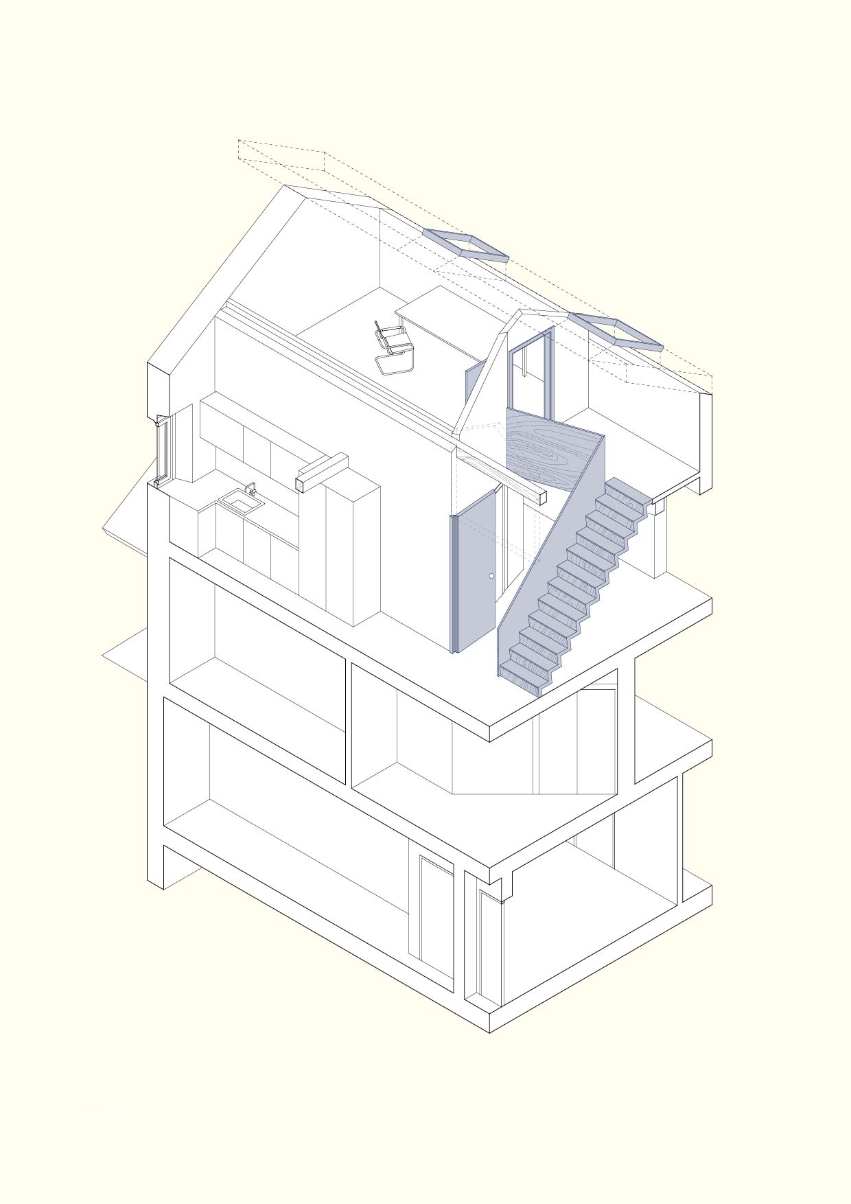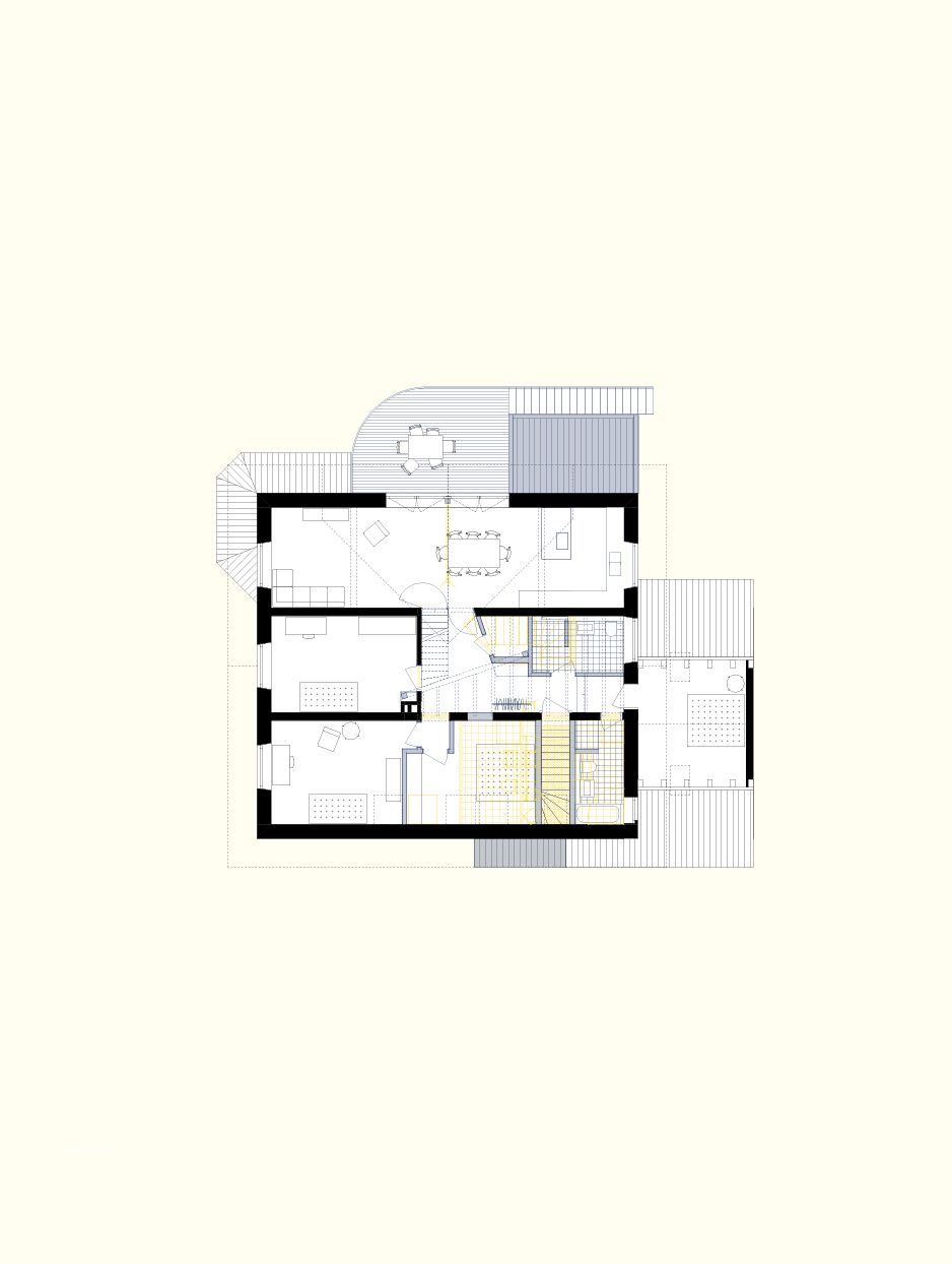 Ein Einfamilienhaus, das schon viel ist und sich knapp 30 Jahren nach seiner Errichtung verändern wird, um zu einem Haus für zwei Familien und drei Generationen zu werden. Auf der Gartenfassade wird das Hausvolumen um einen weiteren Raum für die Erdgeschosswohnung und eine grosszügige Terrasse für die Dachwohnung ergänzt. Im Inneren des Hauses werden die Flure und Treppenräume umgebaut um zu einem gemeinsamen Hauseingang für beide Wohnungen zu werden und neue Raumaufteilungen in den Geschossen mit grosszügigen Wohnräumen, Zimmern und Bädern zu ermöglichen.
